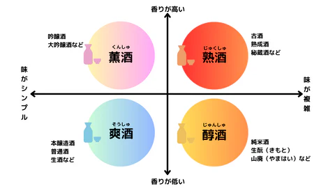 Sake is roughly divided into four groups based on a combination of sweetness (sweet or dry) and richness (light or rich). By checking the alcohol content and acidity level on the label, you can determine the characteristics of its taste. Using this method, you can guess what the sake tastes like without tasting it, which is convenient for selecting sake for foreign customers at restaurants and souvenir shops.