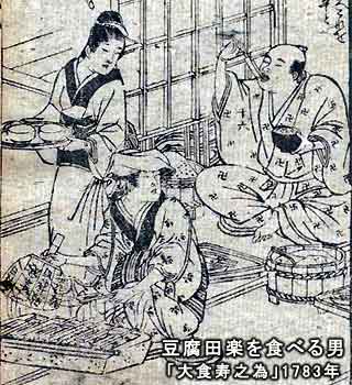 Some of these eating places served food and sake, similar to an izakaya nowadays. In time, commoners began to use these kinds of places to eat and drink. In the late 1730s, a shop opened in Kanda, Edo, serving “Misodengaku” (grilled tofu with miso paste) and sake. It earned a good reputation, and shops serving sake and food spread throughout Edo.
