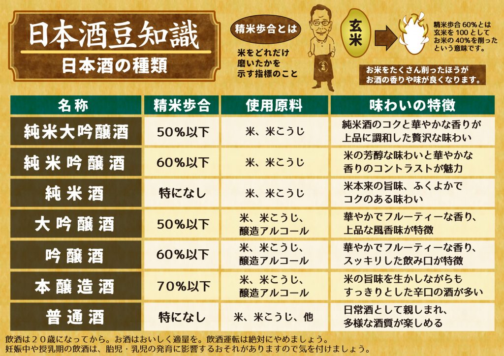Additionally, the price of sake depends on the quality of rice and the rice polishing ratio, which indicates how much the rice grains are polished. The more the rice is polished, the rounder it becomes and the less unpleasant its taste. If the unpolished part accounts for over 70%, it is ‘Honjozo’; under 60%, ‘Ginjoshu’; and under 50%, ‘Daiginjo.’ A higher polishing ratio means more grains are needed, which results in a higher price. Daiginjo is a high-class sake, but not everyone likes it because its taste is too pure.