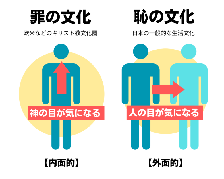 In her book The Chrysanthemum and the Sword, American anthropologist Ruth Benedict describes the contrast between the Guilt Culture of the West and the Shame Culture of Japan. In the West, where Christianity predominates, people are expected to follow religious precepts that dictate codes of conduct, and when they break these precepts, they feel guilty. In Christianity, God is often viewed as a figure who may punish wrongdoing, and to avoid punishment, people regulate their behavior and thoughts according to religious teachings.