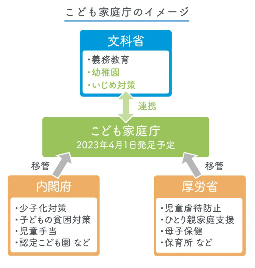 Previously, policies related to children were addressed by separate ministries with little interagency coordination: the Cabinet Office handled the declining birthrate, the Ministry of Health, Labour and Welfare managed nursery schools and child guidance centers, and the Ministry of Education, Culture, Sports, Science and Technology oversaw kindergartens. To resolve this inefficiency, the Children and Families Agency now consolidates responsibilities related to childcare policies, except for kindergartens, which remain under the jurisdiction of the Ministry of Education, Culture, Sports, Science and Technology.