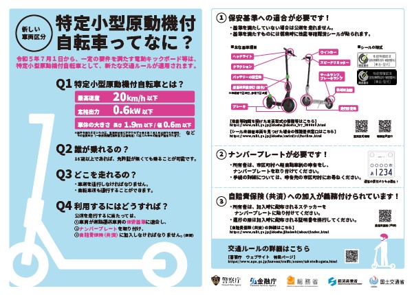 Operating automatic delivery robots (remote-controlled small cars) is now permitted with the goal of enabling autonomous delivery services, provided the vehicle size meets the standards outlined in the advance notification.On July 1, 2023, electric scooters were classified as specified small motorized bicycles, which do not require a license for individuals aged 16 or older. The maximum speed limit is 20 kph, and wearing a helmet is strongly recommended. Several serious accidents involving electric scooters have occurred, raising public concerns about the need for stricter regulations.
