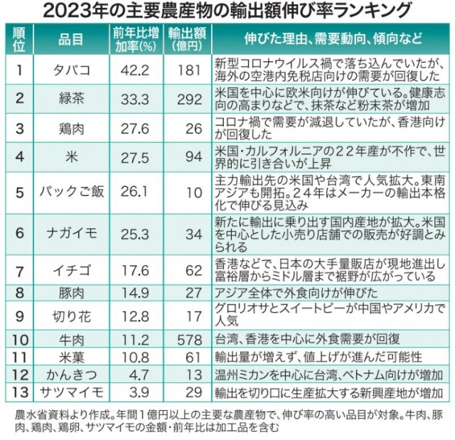 Beef saw an increase in exports due to the recovery of the food-service industry in Hong Kong and Taiwan. The government has set an export goal of 2 trillion yen for 2025 and plans to support global marketing efforts, focusing on key export items.