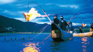 It is a method of catching fish using cormorant birds. It is also done for tourism, and the Nagara River is the best known in Japan. The fisherman handles the cormorants with ropes, letting them swallow a fish, Ayu (sweetfish), and later spit it out.