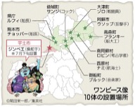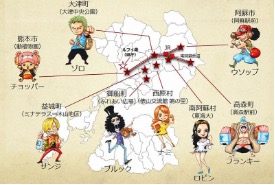 As part of the restoration projects for Kumamoto, which was heavily damaged by major earthquakes in 2016, Kumamoto City, with the aid of the author of One Piece, Eiichiro Oda, has built ten bronze statues of the popular characters. The first statue built is of the leading character Luffy, located in the front yard of Kumamoto Prefectural Hall.