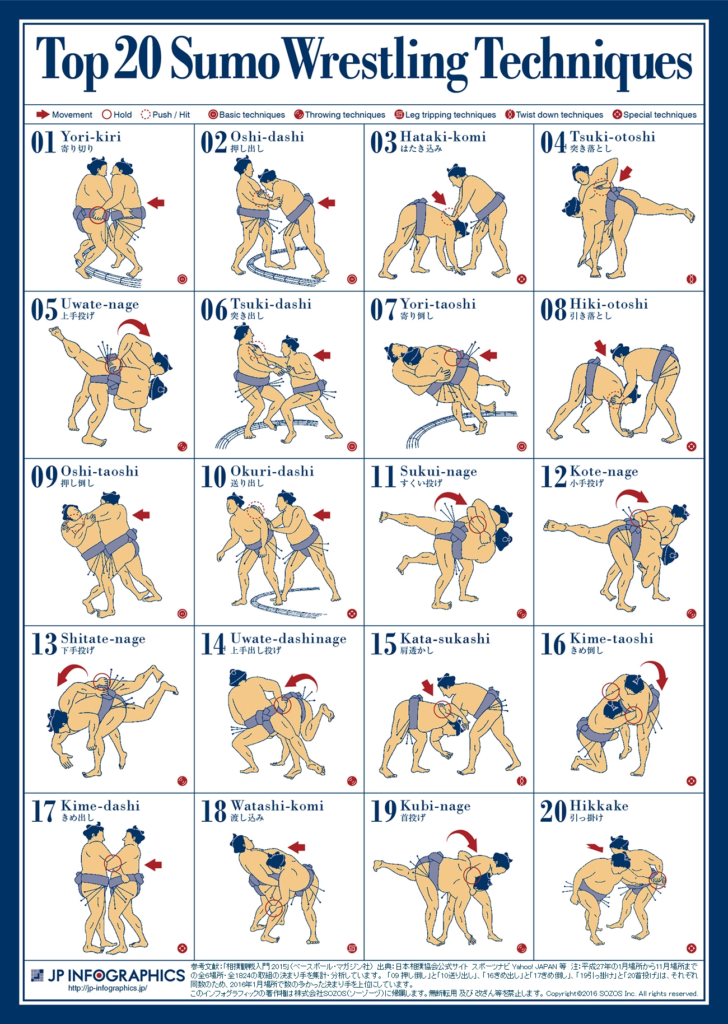 The winning techniques in sumo include pushing, forcing out, lifting, and throwing, among others. In the Muromachi period, there were 48 techniques; now there are 82. A win is achieved when a wrestler forces any part of the opponent’s body outside the dohyo ring to touch the sand, or makes any part of his body other than the soles touch the sand inside the dohyo. Sumo has no weight limit system, and generally, heavier wrestlers tend to be stronger. The heaviest wrestler on record was 292 kg! However, weight isn’t always decisive; agility and skills are also important factors, as they say, “Jyu-yoku-Go-wo-seisu (The soft overcomes the hard),” meaning that skill and technique can overcome brute strength. Watching the matches of wrestlers with a big difference in weight and physique is one of the attractions of sumo.