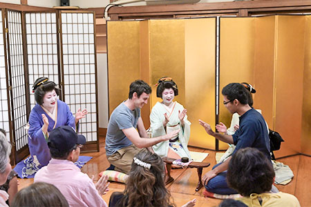 In the middle of the Edo period, on the approach to Yasaka Shrine in Kyoto, there stood “Mizuchaya” (water tea shops) serving tea and Dango sweet dumplings to visitors and travelers. Later on, the shop girls began performing singing and dancing to attract customers, and this is said to be the origin of Geiko and Maiko. Eventually, more and more people came just to see their performances, and the shops competed with each other by dressing the girls in beautiful kimonos and having them host guests with food and sake. This led to the present culture of Geisha. Geisha girls were not prostitutes but were skilled in playing the Shamisen (a guitar-like string instrument), singing, and dancing. Now they are usually called “Geiko” (performing girl) to avoid being misunderstood as prostitutes. “Maiko” (dancing girl) is a young girl aged 15 to 20 who is a trainee to become a Geisha. Now, if you want to experience the world of Geisha, you must go to a Japanese restaurant in a group and first enjoy eating, drinking, and talking with a Geisha girl or two. Then you can appreciate their traditional performances of dancing and playing the Shamisen, and when the party gets fully excited, you can play some games called “Ozashiki Asobi” (games in the tatami mat room) with the girls.
