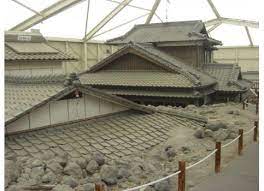 Next to Road Station “Mizunashi Honjin Fukae,” eleven damaged houses from the mudslide caused by the eruption of Unzen Fugendake are preserved and exhibited.