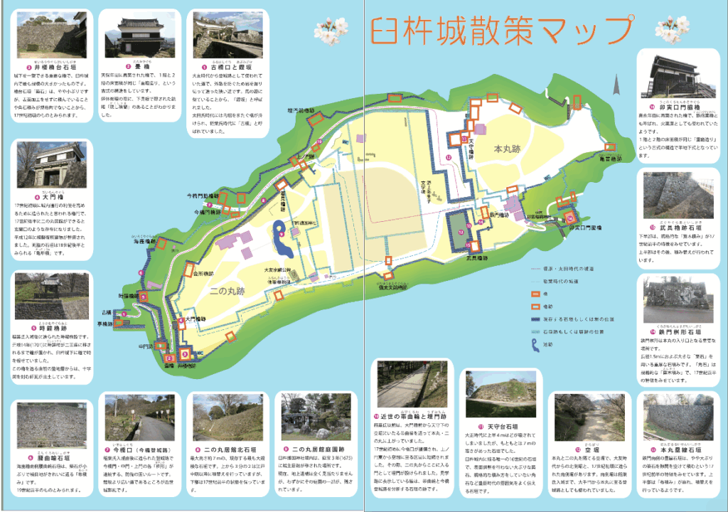 The Honmaru and Ninomaru areas have been developed into a city park featuring two towers, a reception hall, and a garden, serving as a leisure space for local residents. In spring, it is a popular spot for cherry blossom viewing.