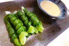 Hitomoji Guruguru is a traditional side dish from Kumamoto. Thin spring onions are boiled, then the white root ends are used to roll the green tops into a coiled shape. It is typically served with a miso paste seasoned with vinegar. The name comes from hitomoji (a type of green onion) and guruguru (an onomatopoeia for something coiled or rolled).