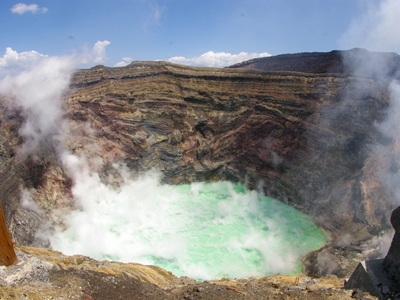 This is the crater of the active Naka-dake Cone. Around the rim of the smoking crater, you can enjoy dramatic views of the rugged volcanic landscape. The site is accessible via a toll road, by ropeway, or on foot. Note that access may be restricted depending on volcanic activity.