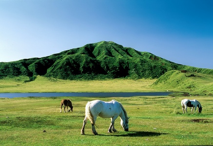 Kusasenri is a green field that stretches about one kilometer across the northern slope of Eboshi Cone. It is the remnant of a double volcanic crater and features a pond at its center. The peaceful scene of horses grazing calmly against the backdrop of the steaming Nakadake Cone is one of the classic views of Aso.