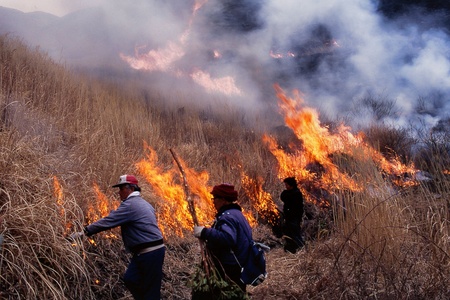 Field burning is a major seasonal event in Aso. Around the spring equinox, a day with a gentle breeze is chosen. Once the fire is set in the fields, which have dried out over the winter, it spreads rapidly across the slopes. It is an impressive spectacle.