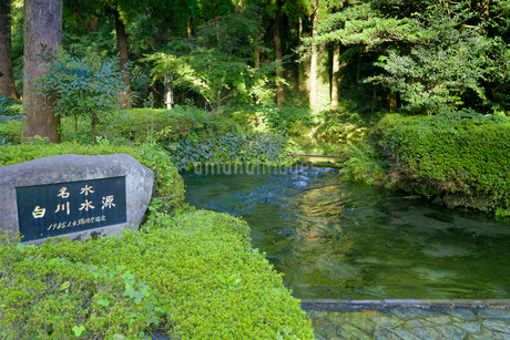 The Shirakawa district in Minami Aso Village, surrounded by Mount Aso and its southern rim, is known for its many natural springs. The Shirakawa River flows northwest along the southern edge of the village toward the distant Ariake Sea. Its source is Yoshimi Shrine, which boasts the largest spring in the district, with a daily discharge of ninety thousand tons. The water remains at a constant temperature of 14°C (57°F) year-round and is so clear that you can see it bubbling up from the sandy bottom.