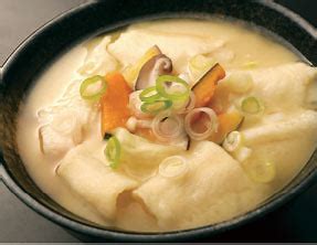 The dish is a hearty miso soup containing the dumplings along with various vegetables such as taro, shiitake mushrooms, daikon radish, burdock root, and carrots.