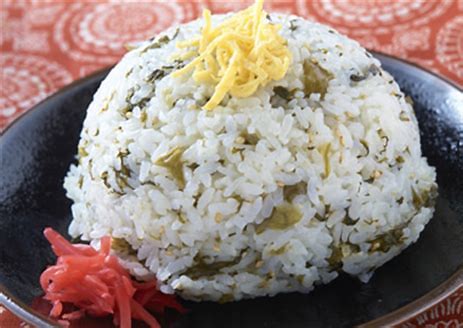 This dish is Takana fried rice, a local specialty of Kumamoto. Takana is a leafy green vegetable grown in and around the region, often pickled and used in various dishes. It is prepared by stir-frying rice with pickled takana and egg.