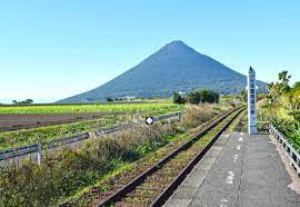 “Mt. Kaimondake, a volcano on the southern edge of the Satsuma Peninsula, rises to a height of 924 m. Its beautiful conical shape earns it the nickname ‘Satsuma Fuji.'”