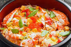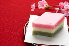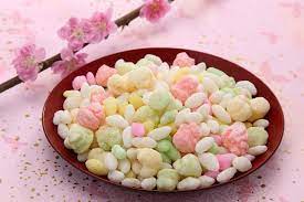 Clam clear soup, Hisi rice cake (in the shape of a diamond), Hina rice cracker (made from broken pieces of Hisi rice cake), Chirashi sushi (sushi sprinkled on the top with ingredients like egg, shrimps and vegetables), and sweat sake.