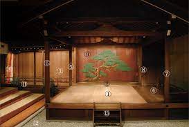 The stage is also simple. It is just an open space with no sets or stage curtains. The backdrop, called “Kagamiita” (mirror board), features a large pine tree. The singers and musicians are also on the stage.